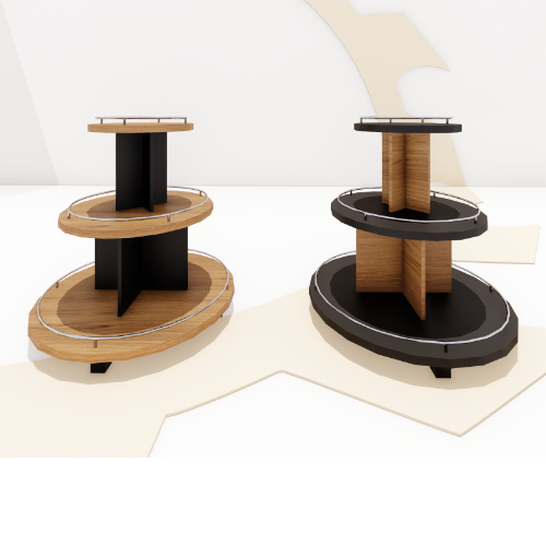 Expositor projetado com três níveis, sendo o primeiro 0,80 cm, segundo 0,65 cm e terceiro 0,45 cm, sentido inferior para superior. Destinados a expôr garrafas de bebida, produtos em promoção ou produtos embalados com pouca variedade. Situados na entrada de loja ou centro.
