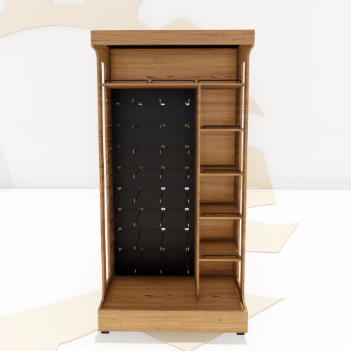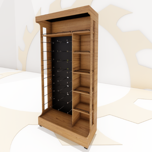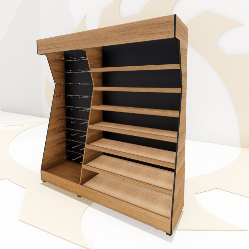 Expositor projetado propriamente para condimentos e temperos dentro de um único móvel. Sendo um lado divido para ganchos, para suspender os produtos por todo expositor e outro lado com prateleiras, com sete divisões, seis prateleiras. Acabamentos em madeira e borracha preta.