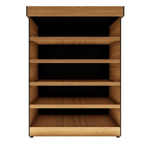 Expositor destinado a produtos de mercearia em geral. Com cinco divisões, quatro prateleiras, acabamentos em madeira e borracha preta e iluminação na parte superior com lâmpada tubular.