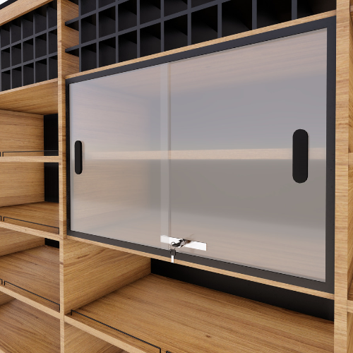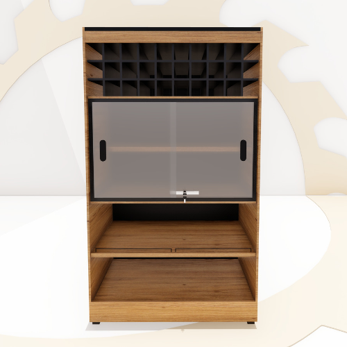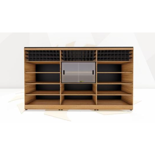 Expositor destinado a vinhos e bebidas relacionadas. Com cinco divisões, quatro prateleiras e podendo na parte superior do expositor armazenar vinhos em suas caves. O móvel central apresenta porta de vidro com fechadura para proteção de produtos, caso necessário. Podendo ter até duas portas no mesmo móvel. Acabamentos borracha preta e aço e iluminação.