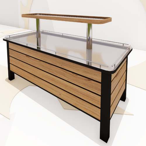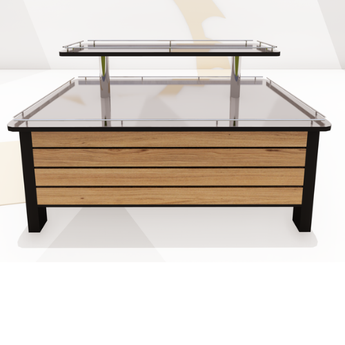 Banca central de dois níveis, de quatro apoios em estrutura de ferro, fechamento laterais em madeira com frisos em preto. Primeiro nível, superfície em chapa de aço inox, acabamento em borracha preta e suportes em aço inox aparafusados nas bordas. Segundo nível fixo ou móvel, com superfície em chapa de aço inox, acabamento em madeiras e apoios com revestimentos em tubo de aço inox. Situada na área de Hortifruti e destinadas a expôr frutas e legumes em geral.